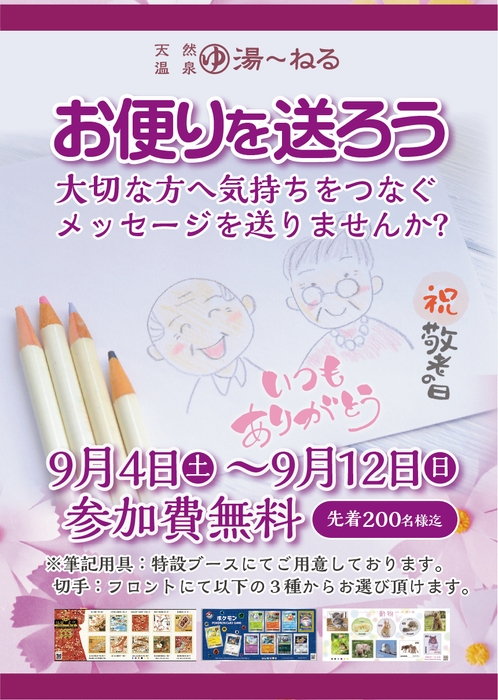 株式会社ヒカリシステム(本社:千葉県千葉市稲毛区山王町、代表:金光 淳用)は、同社が運営する新習志野駅前の天然温泉 湯~ねるで、お客様が思いを込めたハガキを敬老の日に無料で届けるキャンペーンを実施します。2021年9月4日から9月12日まで、施設内でお渡しするハガキで作成いただくと、9月20日までにおじいちゃん・おばあちゃんのお手元に到着するようお届けします。
