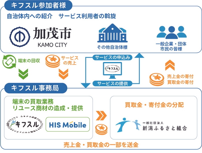 新潟県の自治体・団体で集めた不要な携帯端末を買い取って生まれた収益や、HISモバイルの通信サービスを利用して生まれた利益の一部を、新潟ふるさと組合を通じ、ふるさと基金として自治体に寄付する、地消地産型のプラットフォームとしてスタートします。