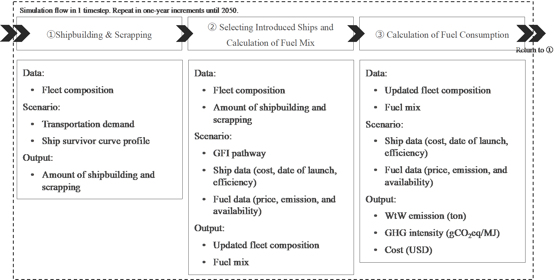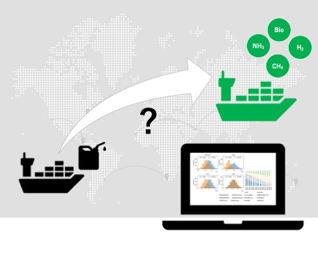 本研究では、船の建造、燃料選択、コスト計算を統合的に計算できるシミュレーションモデルを構築しました(図1)。さらに、従来の輸送需要や燃料価格の不確実性を考慮するため、モンテカルロ・シミュレーションを行い、制度への影響を分析しました。