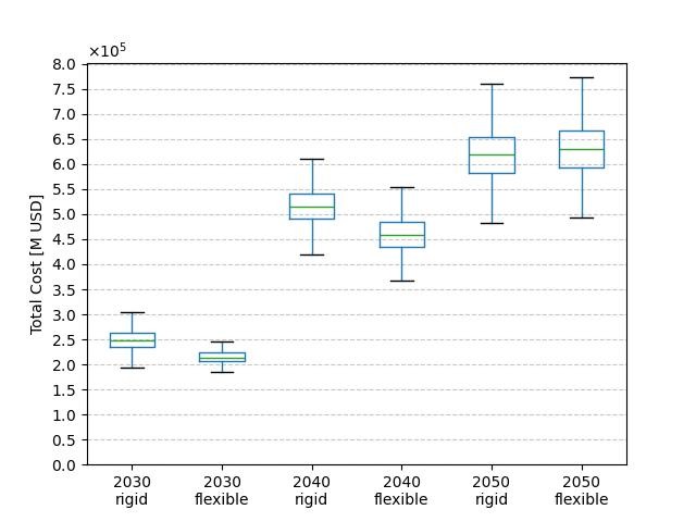 結果として、GFIへのPoolingの導入は短期的な規制遵守コストを低減しうることが示されました。これは、個々の船舶単位ではなく、船隊全体として柔軟に燃料を選択できるようになるため、運航者がよりコスト最適な燃料を利用できることによるものです。また、将来の不確実性に起因するコストのばらつきも抑制され、短期的な規制対応の安定性向上にも寄与することが確認されました。一方で、長期的にはPoolingによって従来燃料船の退場が遅れることで、最終的にバイオディーゼル等の利用が不可欠となり、バイオ燃料の価格が高価になった場合は、コストが逆に上昇する可能性があることも示されました(図2)。制度に柔軟性を持たせると同時に、従来船舶の入れ替えを促進する仕組みを持つことが重要と言えます。