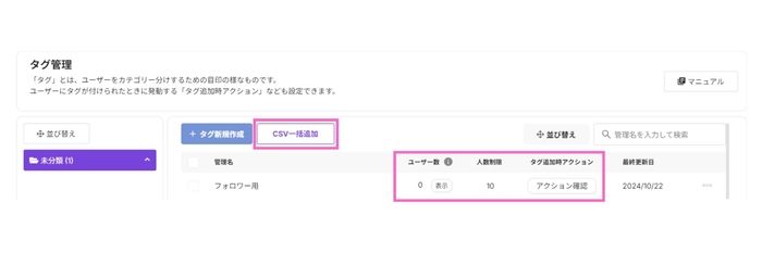 「〇〇に興味あり」「アンケート回答済み」「商品購入者」などお客様の属性や状態に応じたタグを設定することで、ユーザーごとの特徴を簡単に把握できます。