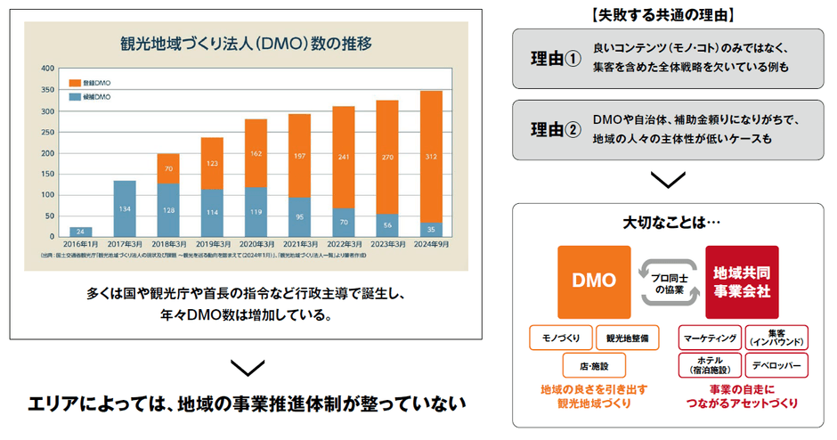 近年、国の政策により観光地域づくり法人(DMO)が増加しているものの、エリアによっては、部分的なブランディングに留まり、国内需要に限定される、あるいは一部助成金に依存している状況にもあります。特に、多くの観光地の課題となっているグローバル視点で低認知、日帰り中心など、地域内での消費や滞在に結びつかず、事業性が確保できないといった現象が見受けられます。本来、地域が持つ素晴らしい資源や魅力を最大限に活かし、グローバルに注目されるブランドへ価値を上げるためには、単なるプロダクト開発のプロデュースや表層的な地域ブランディングではなく、地域全体のグランドデザインからビジネスモデル構築、ファイナンス、オペレーション、そして海外を含めた外からの集客までを一貫して牽引する新しいチームが必要とされています。