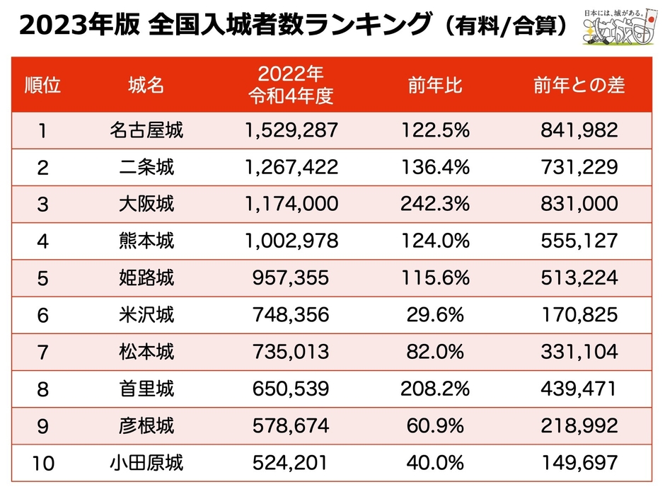 日本全国の城好き・城めぐり愛好家が利用するサイト「攻城団」を運営する攻城団合同会社(代表:河野 武)は、全国180城の管理事務所や自治体、観光協会の協力を得て、毎年恒例となっている全国のお城の入城者数を調査しました。