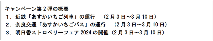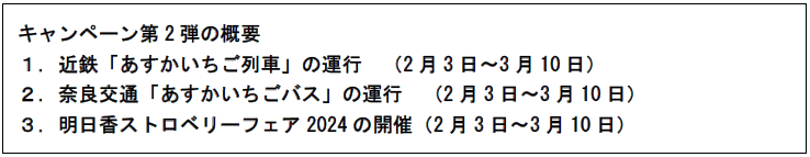 今回、キャンペーンの第2 弾として、明日香村、近畿日本鉄道株式会社(本社:大阪府大阪市、代表取締役社長:原恭、以下近鉄)、奈良交通株式会社(本社:奈良県奈良市、取締役社長:田中耕造、以下奈良交通)と協力し、2024 年2 月から3 月にかけてイベント等を実施します。