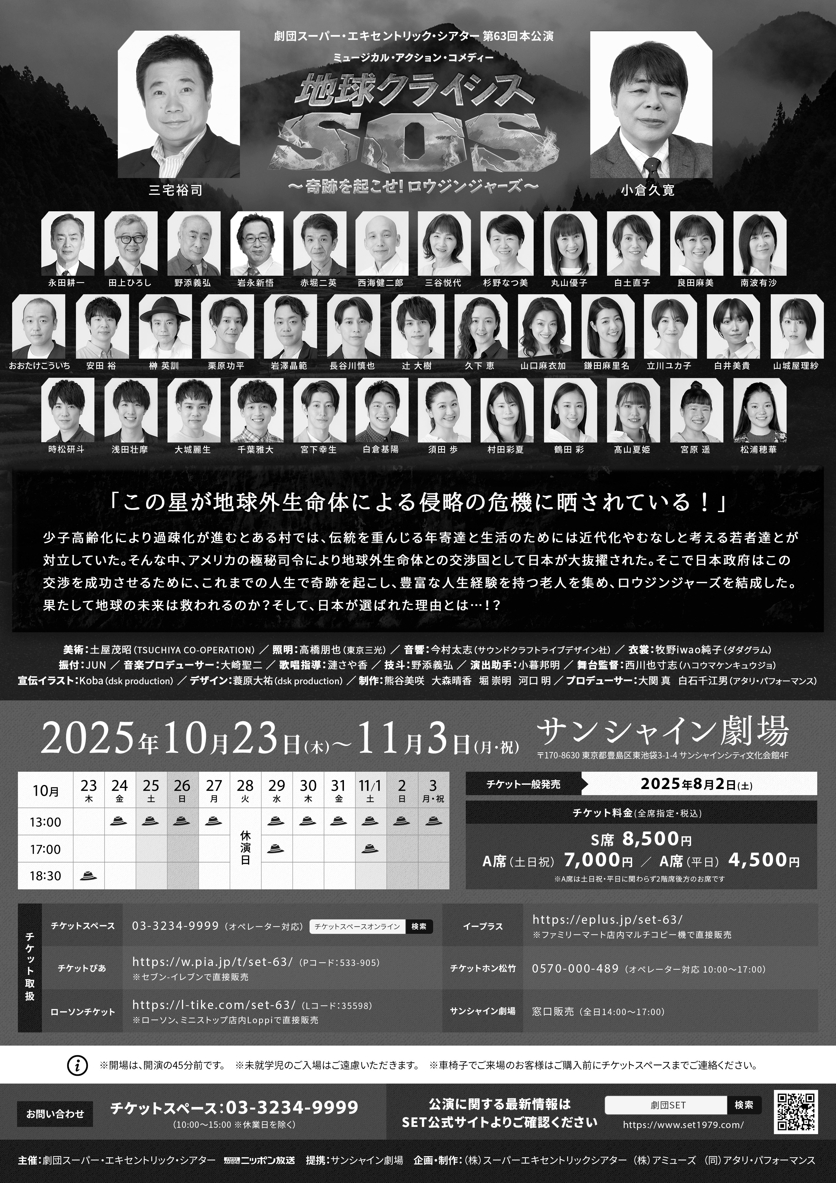 劇団スーパー・エキセントリック・シアター 第63回本公演 ミュージカル・アクション・コメディー 『地球クライシスSOS~奇跡を起こせ!ロウジンジャーズ』 いよいよ今月末開催! | NEWSCAST