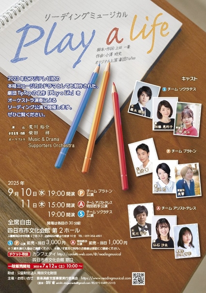 リーディングミュージカル 「Play a Life」が2025年9月10日 (水) 〜 2025年9月11日 (木)に四日市市文化会館 第2ホール(三重県 四日市市 安島 2-5-3)にて開催されます。