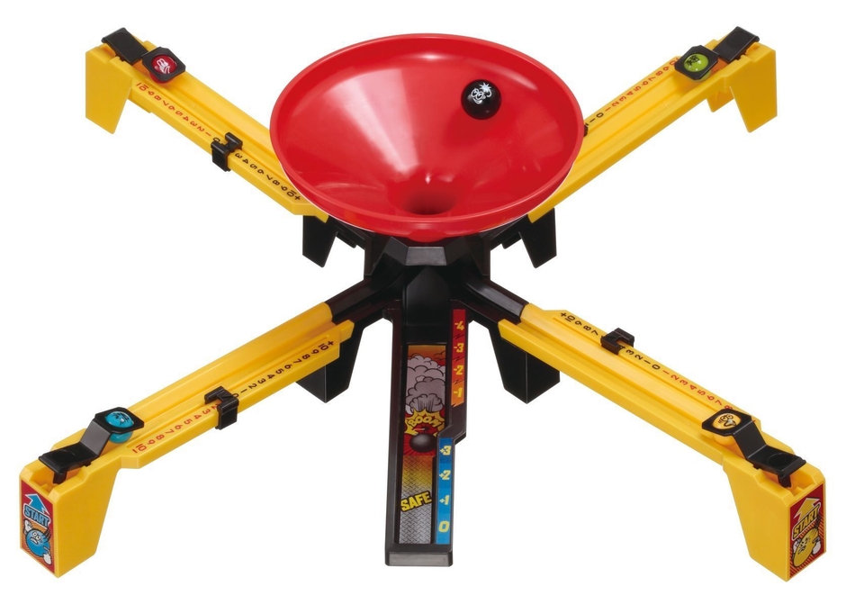 すり鉢状の斜面をぐるぐる回りながら転がってくる黒いボムボール(爆弾)。その球が落ちてくるタイミングを見極めて、いかに自分のボールをボムボールが落ちる直前に落とすことが出来るかを競います。