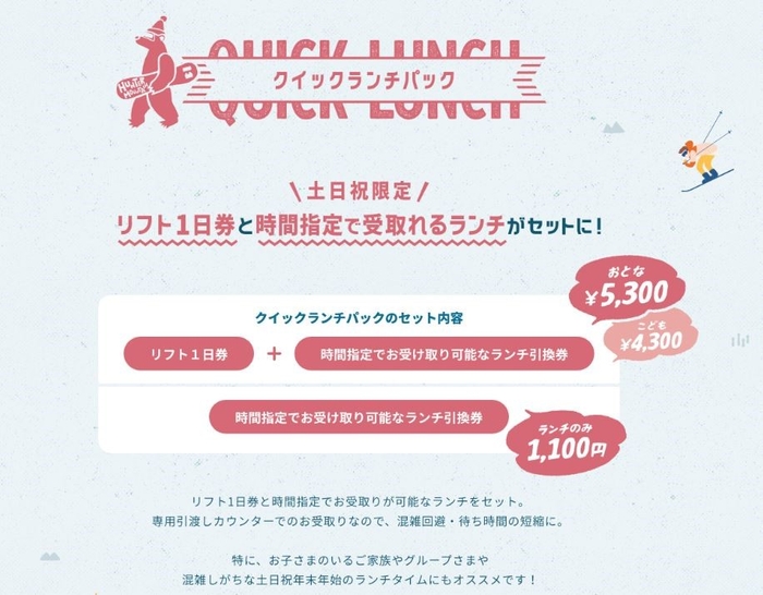 「ハンターマウンテン塩原」(栃木県那須塩原市、総支配人:吉岡厚志)において、指定時間で食事が受け取れる「クイックランチパック」及び新規に「クイックランチ」の販売を開始した事をお知らせします。