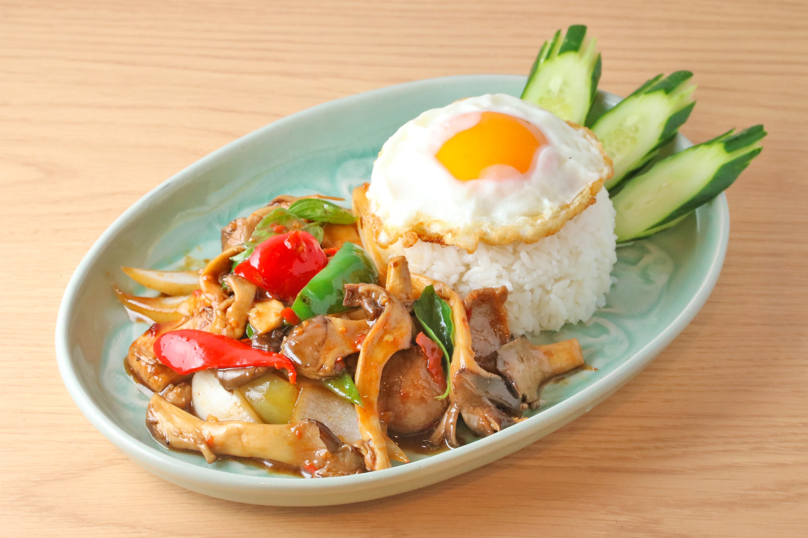 タイの定番料理・ガパオライスに、きのこの中でも旨味と食感に優れた“霜降りひらたけ”をたっぷりと加えました。豊かな旨味が特長の霜降りひらたけは、加熱しても風味をしっかりと保ち、ジューシーな食べ応えです。さらに肉厚にカットしたエリンギを加えることで、異なる2つのきのこの食感を演出。見た目も彩り豊かで、一口ごとに“香り・辛味・旨味”の三拍子を楽しめる贅沢な一皿に仕上げました。