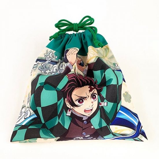 炭治郎のカラーでもある、グリーンを基調としたデザイン。日論刀を手に戦っている姿がデザインされた巾着です。