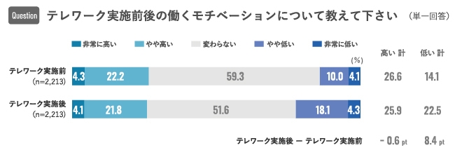 テレワークの実施前後で、「働くモチベーションが低い」と回答した割合が8.4pt増加。