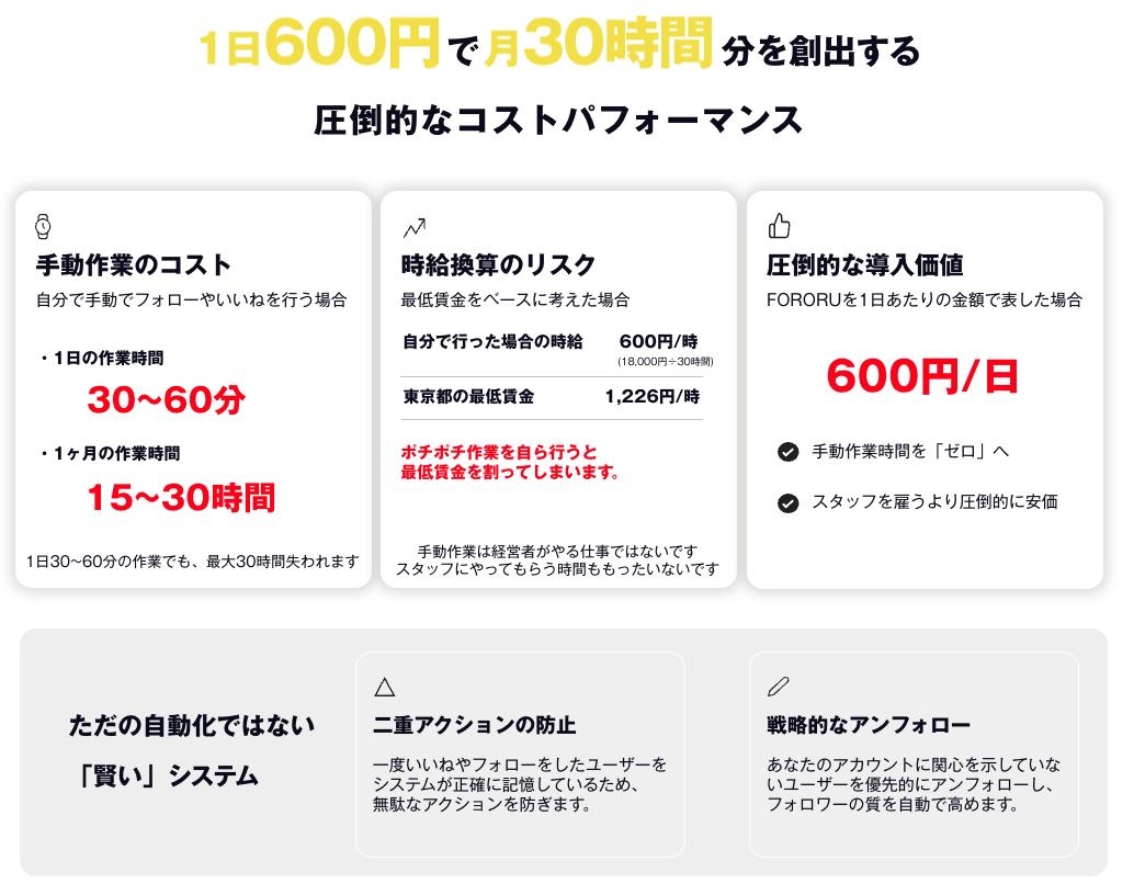 月額18,000円で利用可能。1日あたり600円という手頃な価格で、月に最大30時間の手動作業時間を削減できます。自分で同様の作業を行った場合、時給換算で600円になり、東京都の最低賃金1,226円を大きく下回る非効率な状況を解消します。