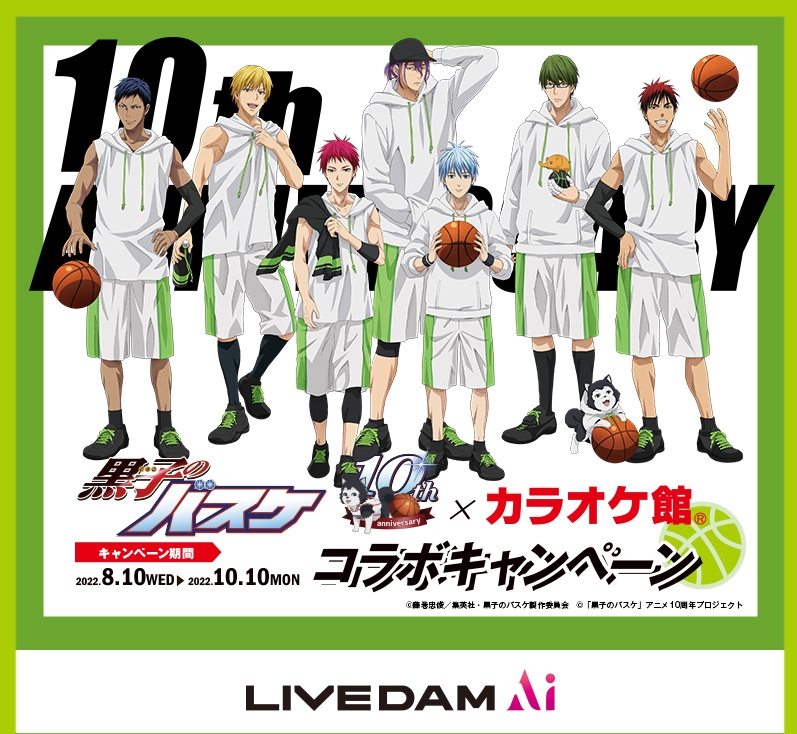 株式会社B&V(ビーアンドブィ)(所在地:東京都練馬区、代表取締役:渡部記春)は、8月10日(水)より全国のカラオケ館において、今年アニメ放送開始より10周年のアニバーサリーイヤーを迎えているTVアニメ『黒子のバスケ』とのコラボキャンペーンをスタートいたします。