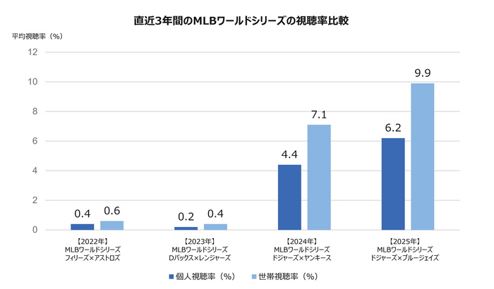 データを見ると、ドジャースがワールドシリーズに進出した2024年と2025年の視聴率が際立って高いことがわかります。特に今年2025年は、個人視聴率6.2%・世帯視聴率9.9%と過去4年間で最も高い視聴率を記録しました。