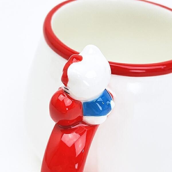 先ほどのデザインに加え、マグカップのもちてにはちょこんとキティの姿に胸キュン確定。後ろからみてもこのかわいさ。しっかりしがみついている姿に愛らしさMAXです。