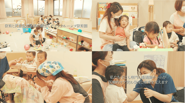 をビジョンに、保育士・看護師をはじめ多職種が連携しながら、保育園での医療的ケア児の受け入れはもちろん、医療的ケア児の一時保育、こども専門の訪問看護ステーション、重症心身障害児のお子さんも通える児童発達支援施設、インクルーシブイベントの開催など「医療的ケア児の居場所づくり」を積極的に行っています。