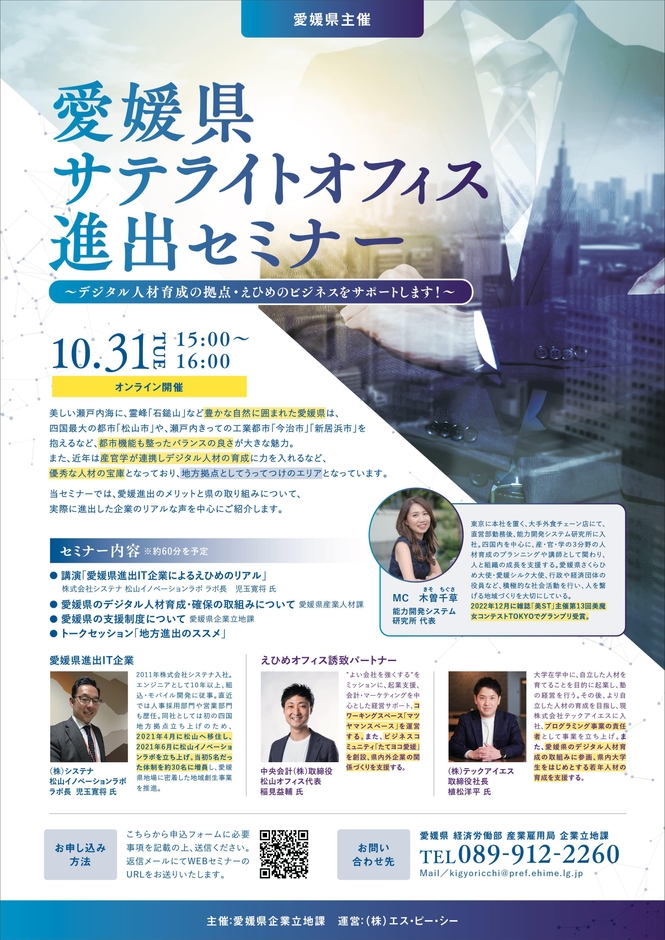 愛媛県は、デジタル人材の育成に力を入れており、地方への拠点開設を検討する企業向けに「愛媛県サテライトオフィス進出セミナー」を2023年10月31日(火)15時からオンラインにて開催いたします。