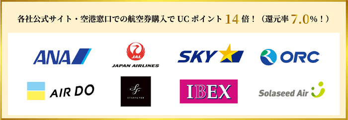 近年の旅行需要の回復を背景に、UCプラチナカードをお持ちの会員さまがより快適で充実した旅行体験をお得にお楽しみいただけるよう、航空会社を対象にポイントアップ店舗として取扱を開始します。UCプラチナカードを使用し、対象店舗で航空券を購入いただくと、ショッピング利用金額1,000円(税込)につき、UCポイントを14ポイント付与します。(通常還元率1.0%+ポイントアップ付与還元率6.0%=還元率7.0%)