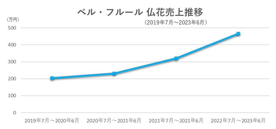 フラワーデザインカンパニーの株式会社ベル・フルール(本社:東京都板橋区、代表取締役社長:今野亮平)が運営するプリザーブドフラワーショップ「ベル・フルール」では、長期間美しさを保つプリザーブドフラワーでアレンジメントした仏花(お供え花)の人気が高まって年々需要は伸長しています。2023年の6月には2019年と比べると2倍以上の売り上げとなっています。ライフスタイルや住環境の変化から、この上昇傾向は、今後さらに拡大していくものと考えられます。