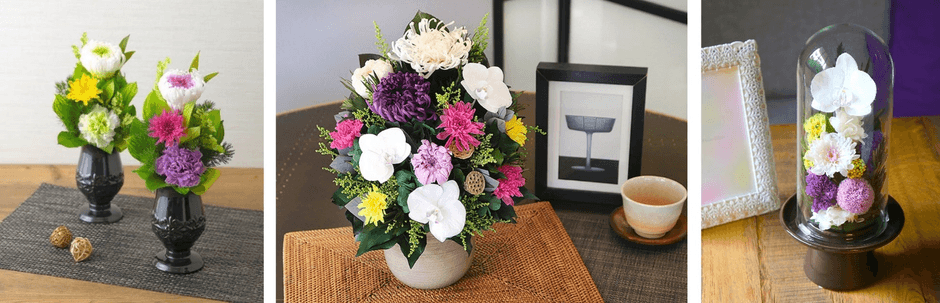 また、ご進物用を選ぶ際は、贈る相手の仏壇サイズなどがわからないことも多いため、いかにも仏花というイメージにとらわれず、プリザーブドフラワーと写真を一緒に飾れるコンパクトなフォトフレームタイプや、お手入れしやすいガラスドームも選ばれています。