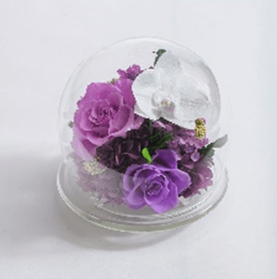 上品な陶器の台座の上にガラスドームを載せた新しいスタイルのお供え花。明るい色調のモダンなデザインで、現代風仏壇にもマッチ。ドームがプリザーブドフラワーをホコリからガードし、長く美しい状態を保ちます。