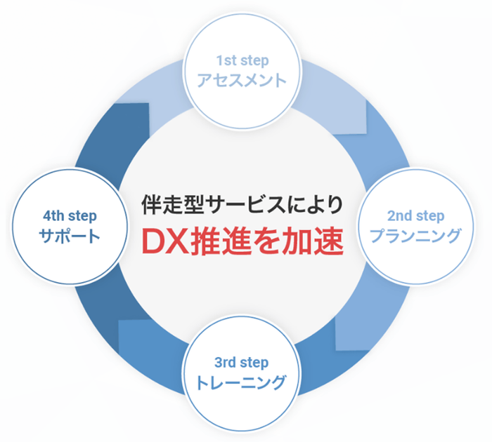 本サービスは、NTTデータ関西のノウハウを活かした3つのコンセプト「現場に寄り添う」、「ノウハウが活用しやすい」、「より高い効果を生み出す」をもとに、(1)アセスメント(現状分析)、(2)プランニング(方針策定支援)、(3)トレーニング、(4)推進サポート(開発支援・QA対応)の4つの支援メニューに分かれた伴走型の支援サービスです。