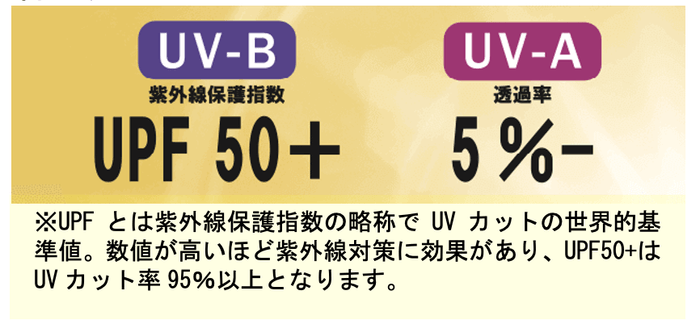 ※UPFとは紫外線保護指数の略称でUVカットの世界的基準値。数値が高いほど紫外線対策に効果があり、UPF50+はUVカット率95%以上となります。