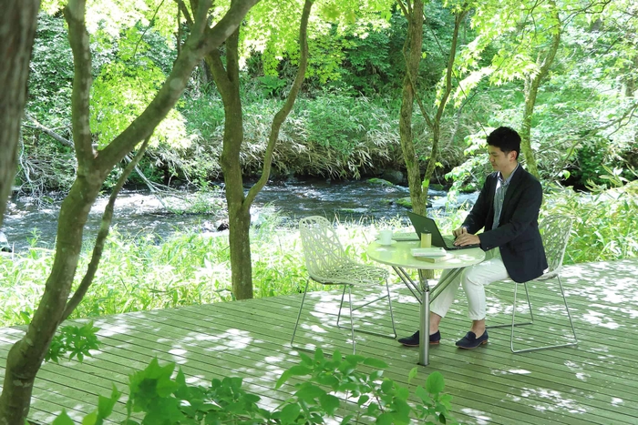 星野エリアでは、森の木々を眺めたり、木漏れ陽の下で川風を感じたり、野鳥のさえずりに耳をすませたり、テレワークに最適なスポットがあります。「ハルニレテラス」のカフェテラスや、「ピッキオ野鳥の森ビジターセンター」に併設された「イカルカフェ」で、軽井沢の自然を感じながら仕事に打ち込めます。