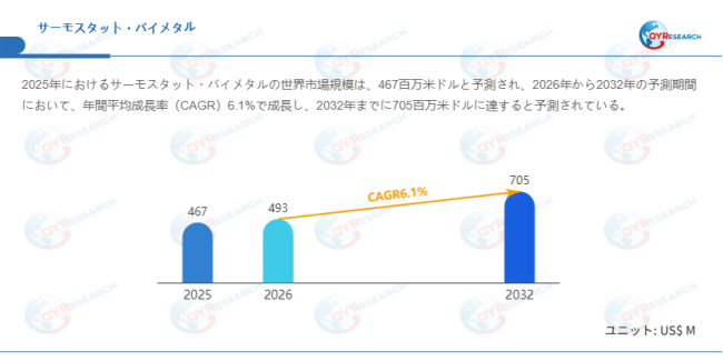 QYResearchが発表した新たな市場調査レポート「サーモスタット・バイメタル―グローバル市場シェアとランキング、全体の売上と需要予測、2026~2032」によると、世界のサーモスタット・バイメタル市場規模は2025年の約467百万米ドルから2026年の493百万米ドルへと順調に拡大すると見込まれ、予測期間中は年平均成長率(CAGR)6.1%で成長し、2032年には705百万米ドルに達すると予測されている。