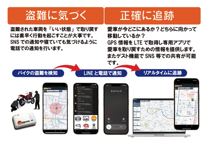 盗難発生時にSNSや警察、友人に伝えるべきことをメモ、写真として事前に保存する機能、並びに現在の車両の位置をWebで共有する機能を提供します。