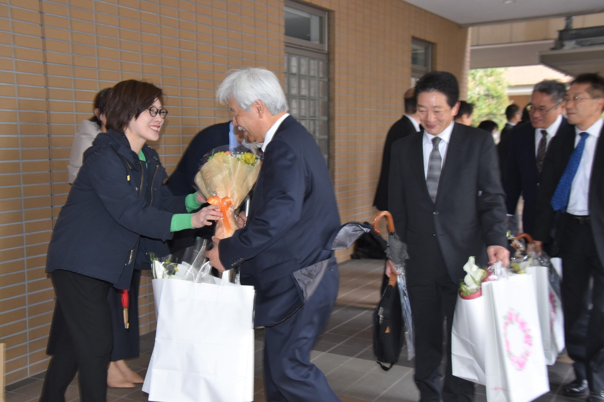 あいにくの雨模様にもかかわらず、式の終了後には共通講義棟北から共通講義棟南にかけて大勢の教職員らが並び、大きな拍手を送ったり、駆け寄って握手を求めたりして、キャンパスに別れを告げる退職者の皆さんを見送りました。
