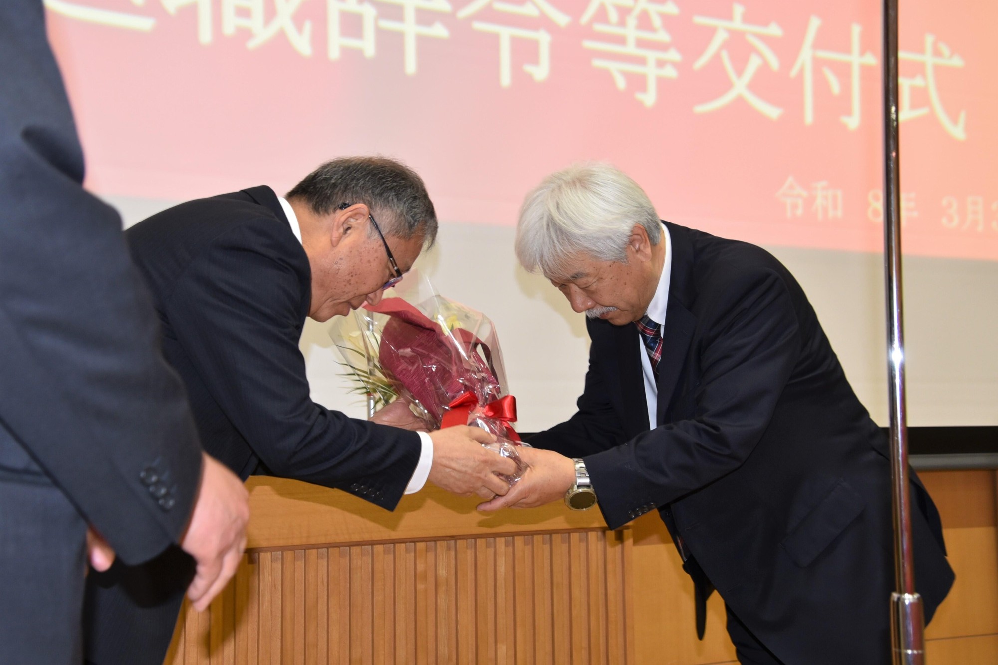 令和7年度の定年退職者辞令等交付式が3月31日、天白キャンパス共通講義棟北の名城ホールで開催され、この日で定年退職して大学のキャンパスや附属高校の校舎に別れを告げる教職員15人(選択定年を含む)のうち11人が出席。小原章裕理事長から感謝状と記念品、野口光宣学長から花束が贈られました。