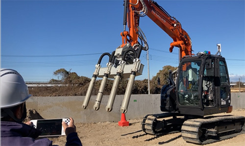 今回開発したバイブレータの旋回や振動の開始・停止を遠隔で操作できるプログラムを、汎用のバックホウ遠隔操作装置と組み合わせることで、バイバック全体の遠隔化を実現しました。これにより専用端末を用いて遠隔操作を行うことが可能です(写真2)。