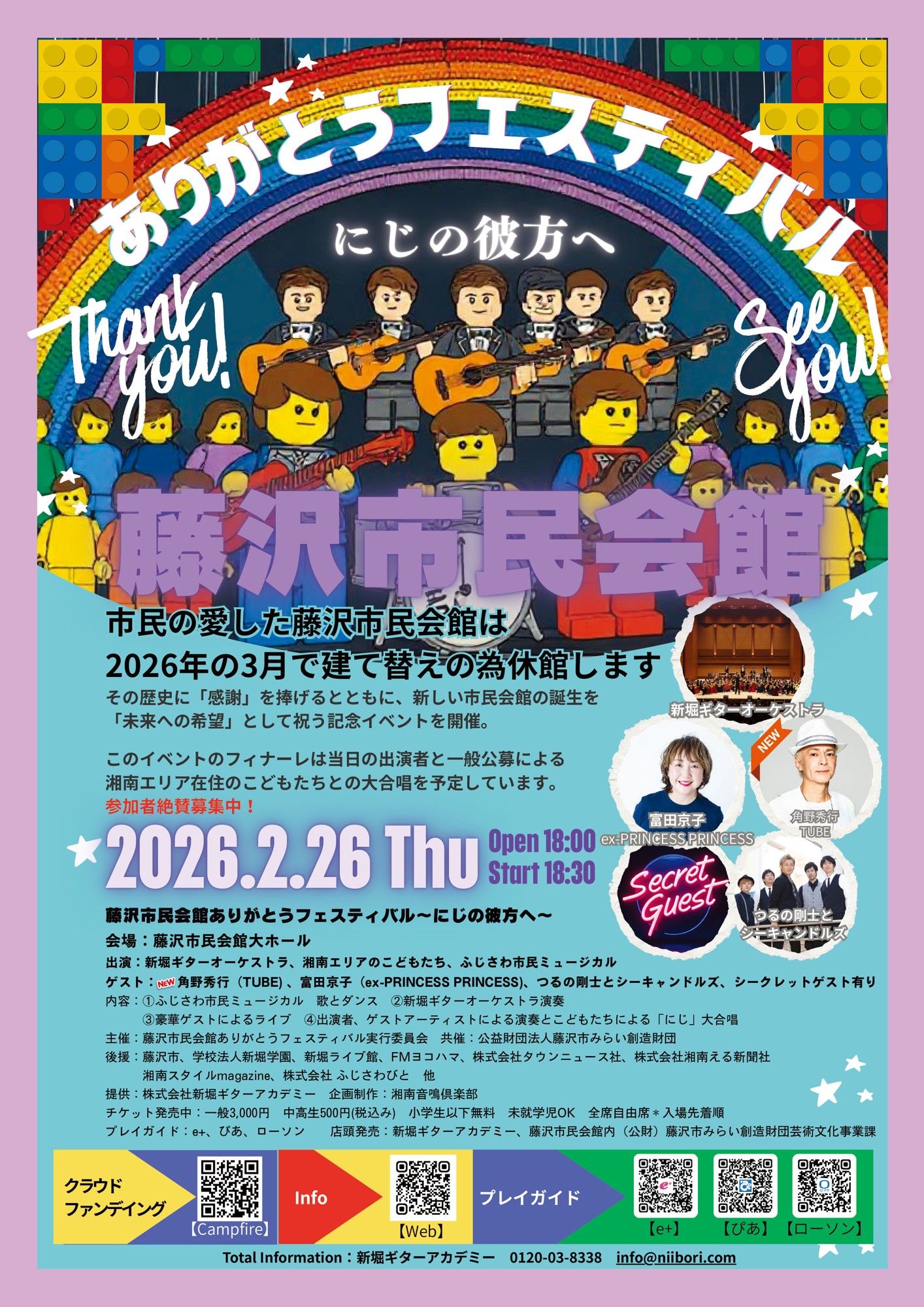 - お問合せ: 藤沢市民会館ありがとうフェスティバル実行委員会事務局 0120-03-8338 info@niibori.com(新堀ギター総合案内)