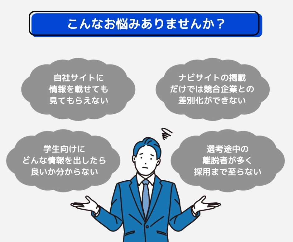 従来型の採用コミュニケーションでは学生に効率よくアプローチできないケースが出てきており、また他社との差別化がしづらくなってきています。