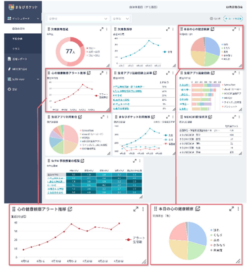 各学校の心の健康観察のデータは、まなびポケットを利用している自治体向けのダッシュボード(※9)に連携され、サマリー情報が可視化されます。ダッシュボードは学校だけでなく教育委員会でも閲覧可能であるため、自治体内で本サービスを利用している全学校のアラート件数の推移を確認し、データから対策を検討することが可能となります。さらに、まなびポケットの保護者向けデジタル連絡機能(※10)を利用している場合は、欠席状況なども同じダッシュボード上に可視化されるため、児童・生徒の様子を一元的に確認することが可能です。