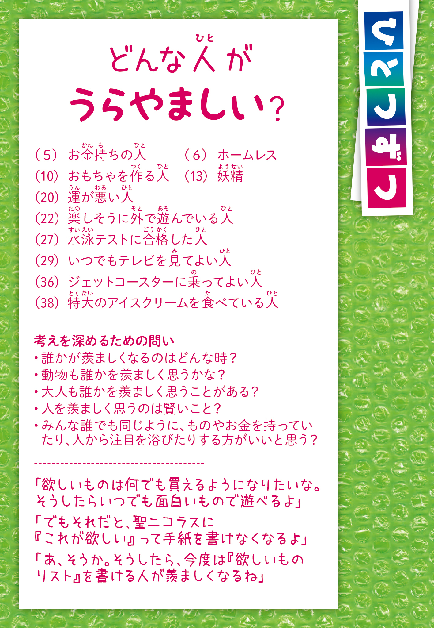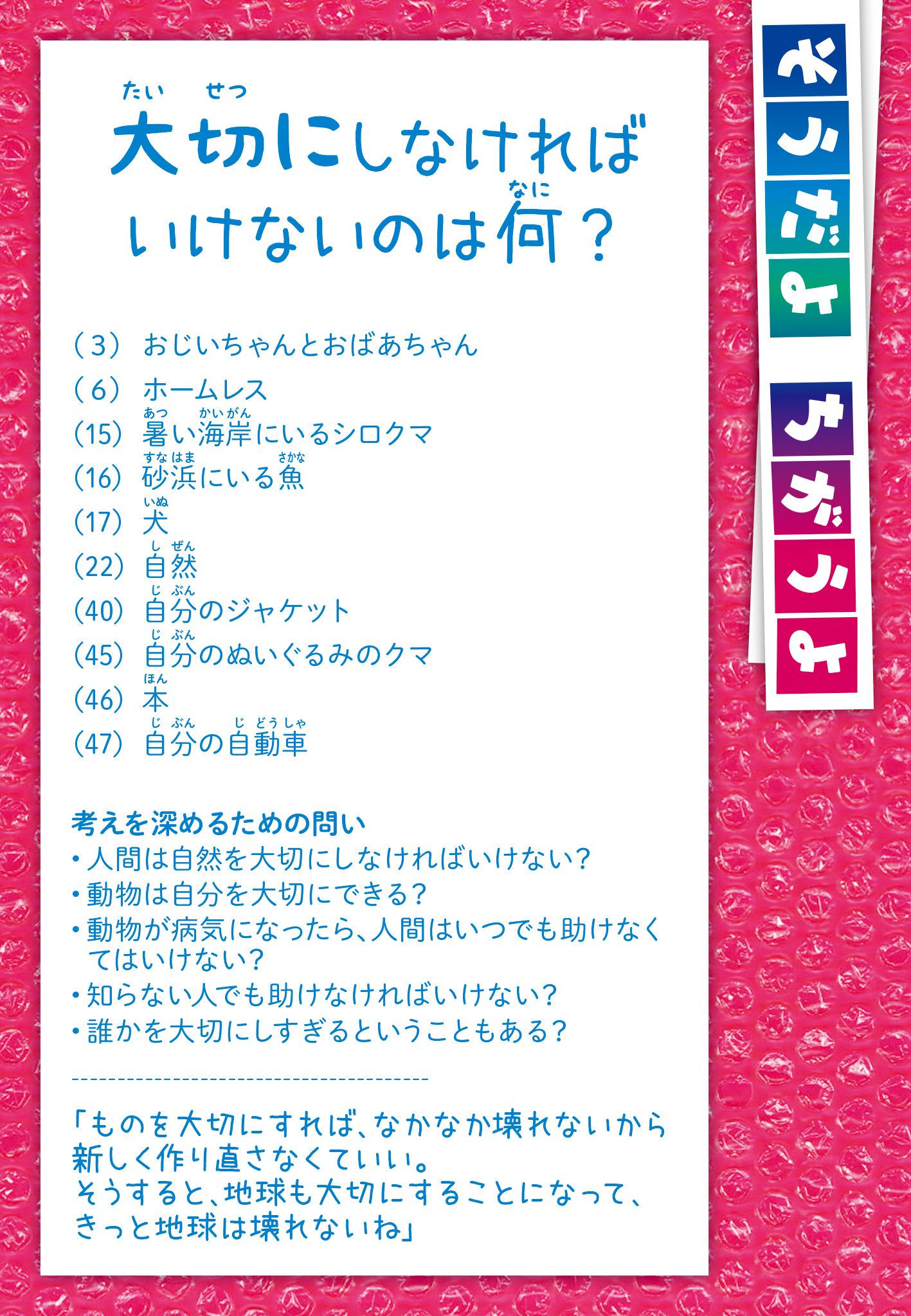 カードの表は子どもたちの身近にあるものや人のイラスト。裏にはそれぞれ1つのテーマとそれに関わる考えを深める問いが書かれています。いくつかのカードを使いながら会話を進めます。