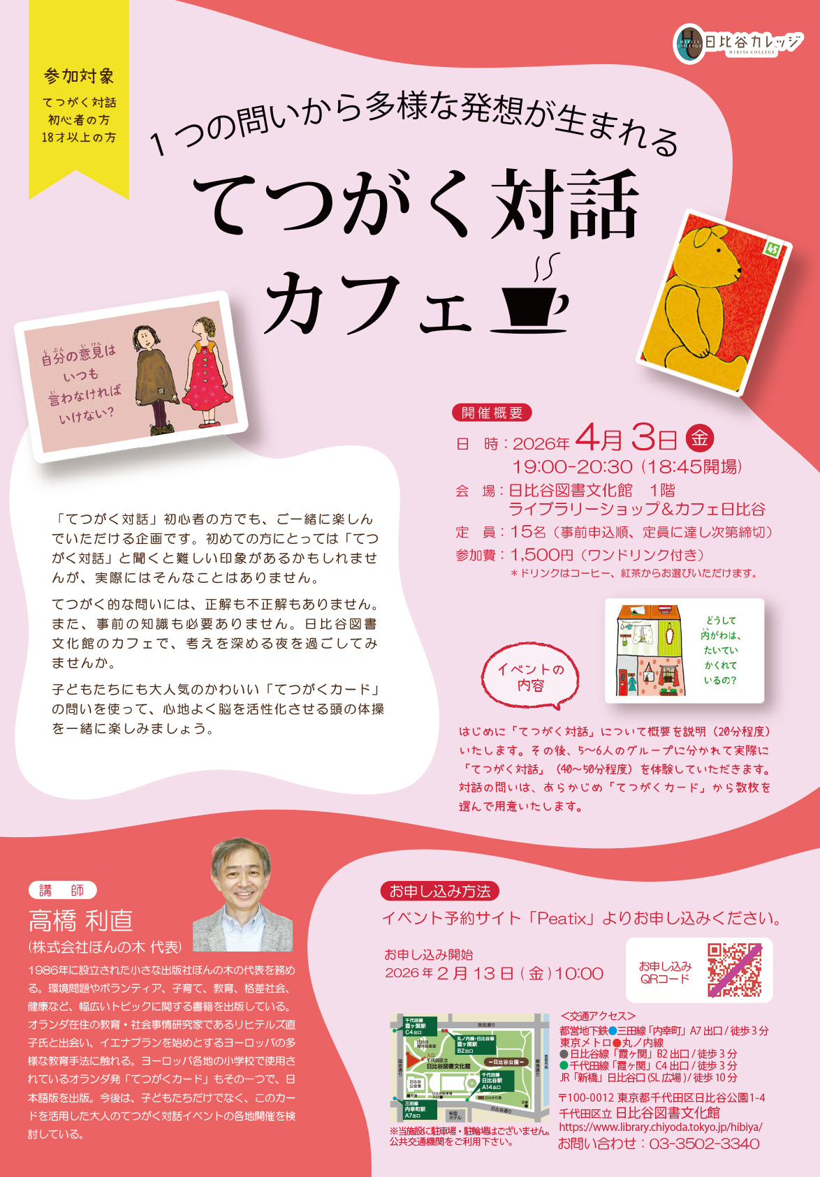日比谷図書文化館日比谷カレッジでは、「てつがく対話カフェ」を2026年4月3日(金)に開催します。講師は株式会社ほんの木の高橋 利直。参加申込は1月23日より受付開始です。