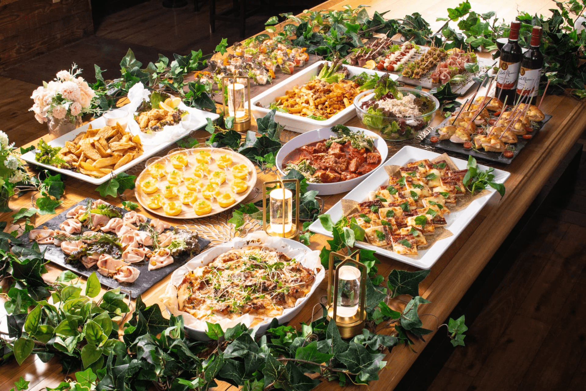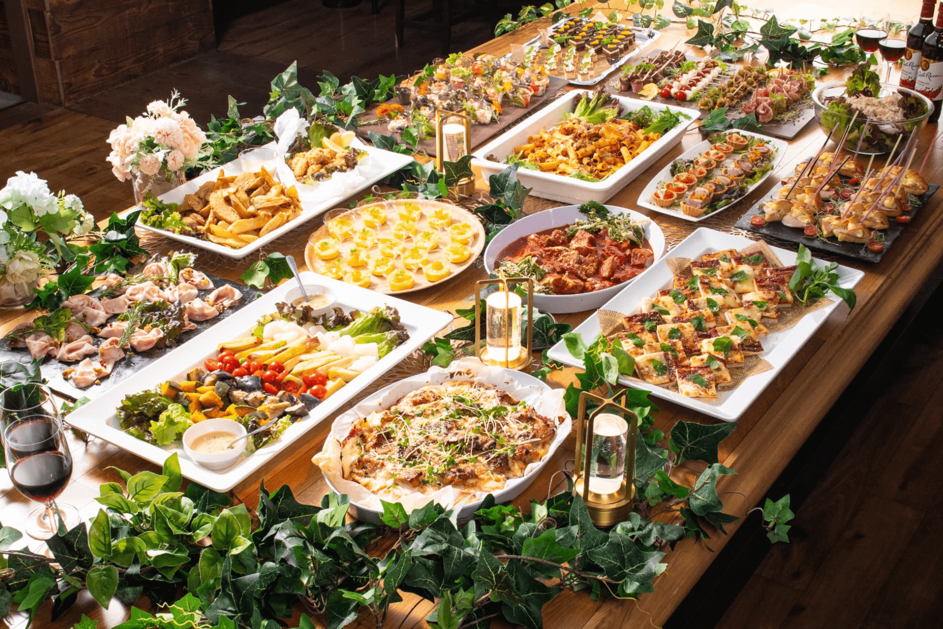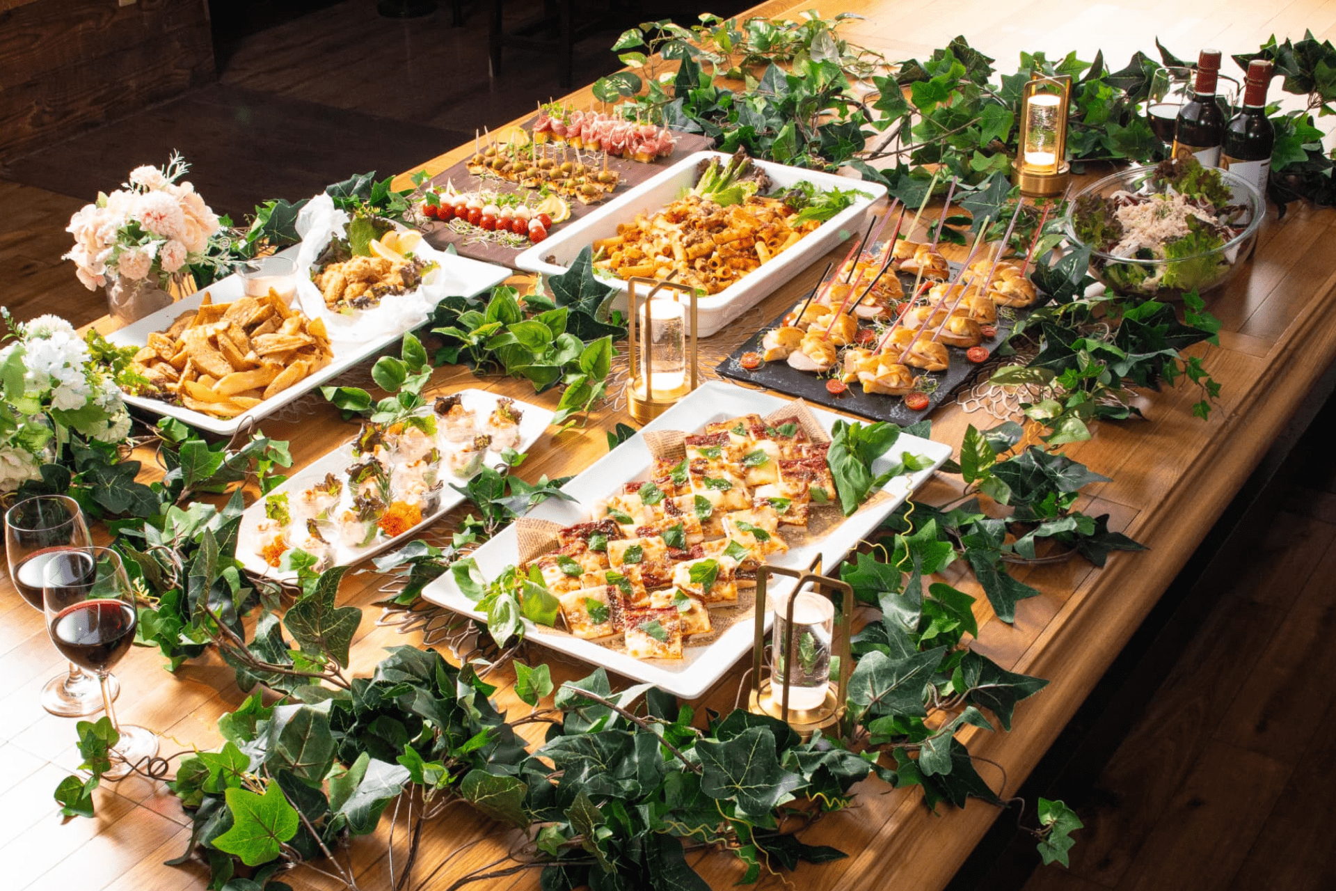 ピンチョスやキッシュなど、片手で食べられるメニューが充実し、立食スタイルの懇親会や結婚式二次会を華やかに演出します。