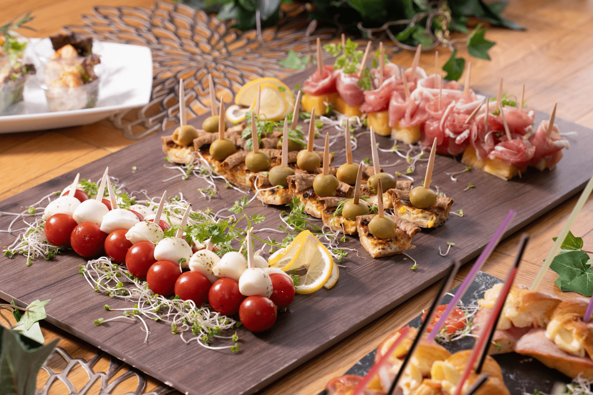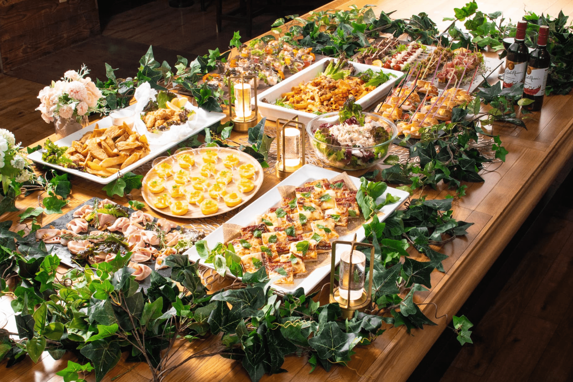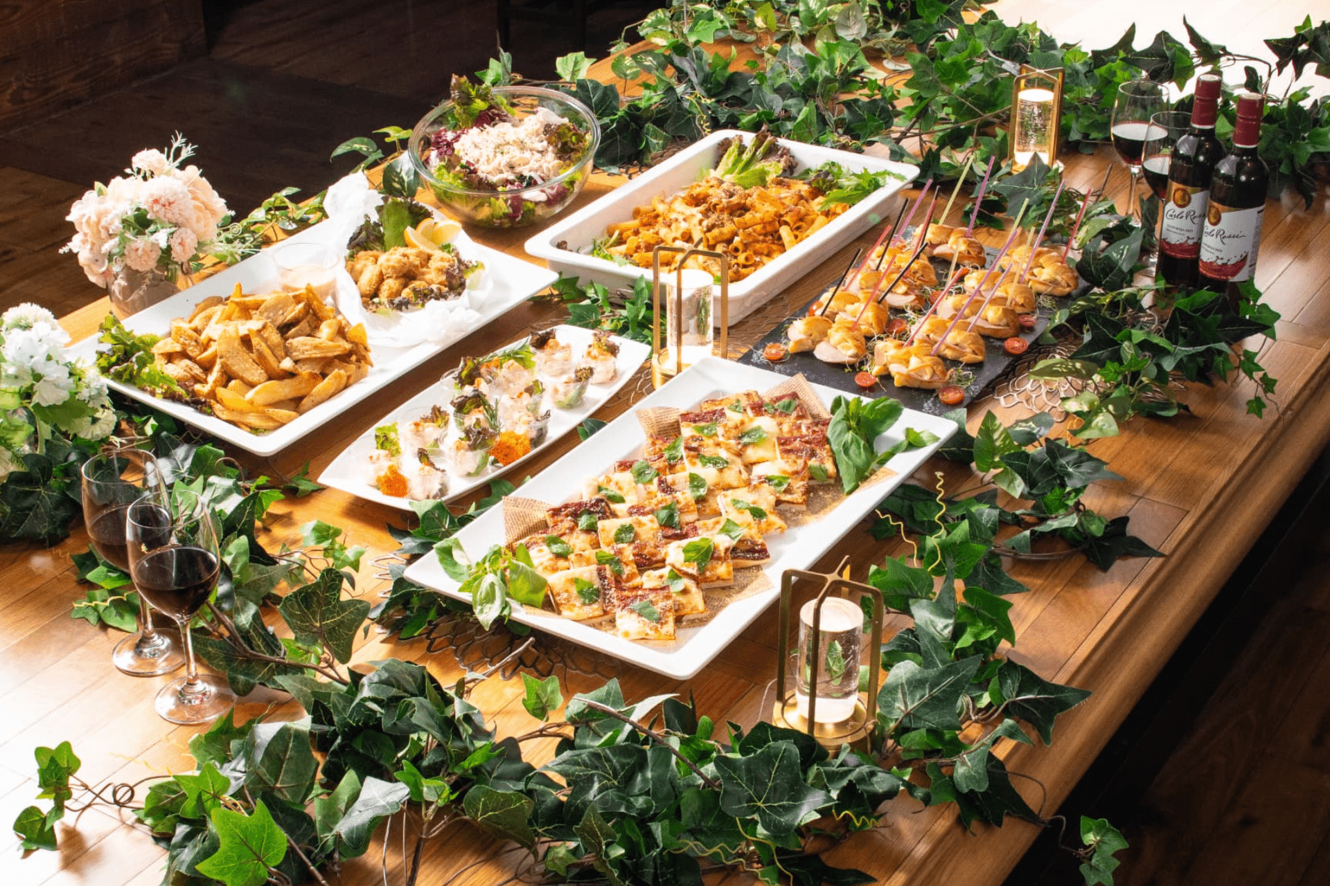 ピンチョスやキッシュなど、片手で食べられるメニューが充実し、立食スタイルの懇親会や結婚式二次会を華やかに演出します。