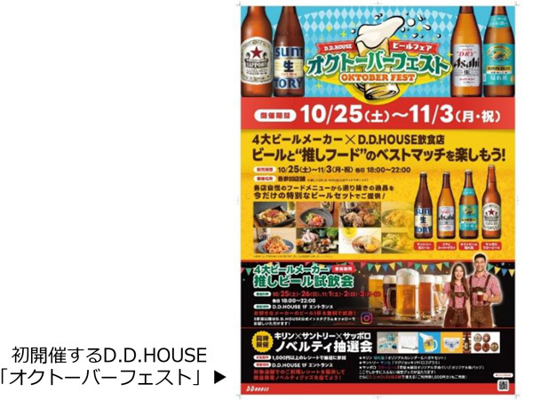 「D.D.HOUSE オクトーバーフェスト」は、施設内の飲食店17店舗が、ビールと「ベストマッチ」すると思う一押しフードをセットで提供します。本イベントでは「アサヒスーパードライ」(アサヒ)「晴れ風」(キリン)「赤星(ラガービール)」(サッポロ)「サントリー生ビール」(サントリー)の4大メーカーのビールをご用意。期間中、本場ドイツさながらの伝統衣装をまとったビアガール、ビアボーイによる4大ビールの週末・祝日限定試飲会のほか、ノベルティや施設のご利用券があたる抽選会も行います。