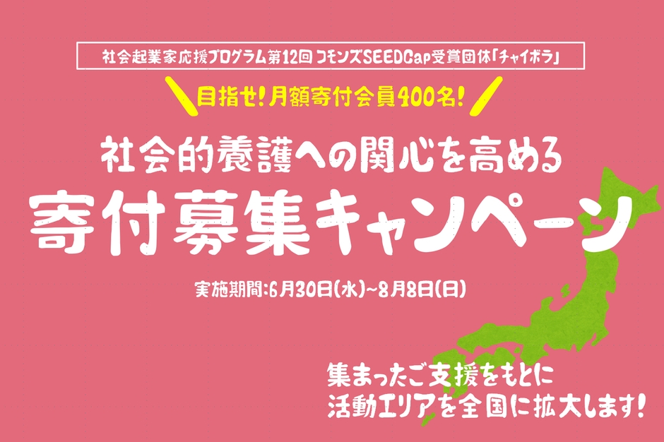 特定非営利活動法人チャイボラ(所在地:東京都豊島区、代表理事:大山 遥、以下 チャイボラ)はコモンズ投信株式会社の主催する社会起業家応援プログラム、第12回コモンズSEEDCapを受賞いたしました。たくさんの方のご声援を胸に、社会的養護についての関心をさらに高めていくための寄付募集キャンペーンを6月30日より開始いたします。