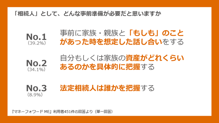 将来の相続に向けて必要だと思う事前準備として、相続人・被相続人のどちらの立場でも「事前に家族・親族と『もしも』のことがあった時を想定した話し合いをする」が最も多く挙がりました。また、「自分もしくは家族の資産がどれくらいあるのかを具体的に把握する」ことも次点にあがり、大切な準備として認識されているようです。