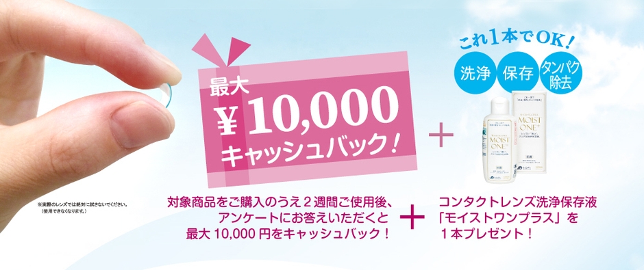 キャンペーン期間中に該当のプラザアイ店舗で対象商品をご購入いただき、2週間ご使用の上、簡単なモニターアンケートにお答えいただいた方に、最大10,000円をキャッシュバックいたします。