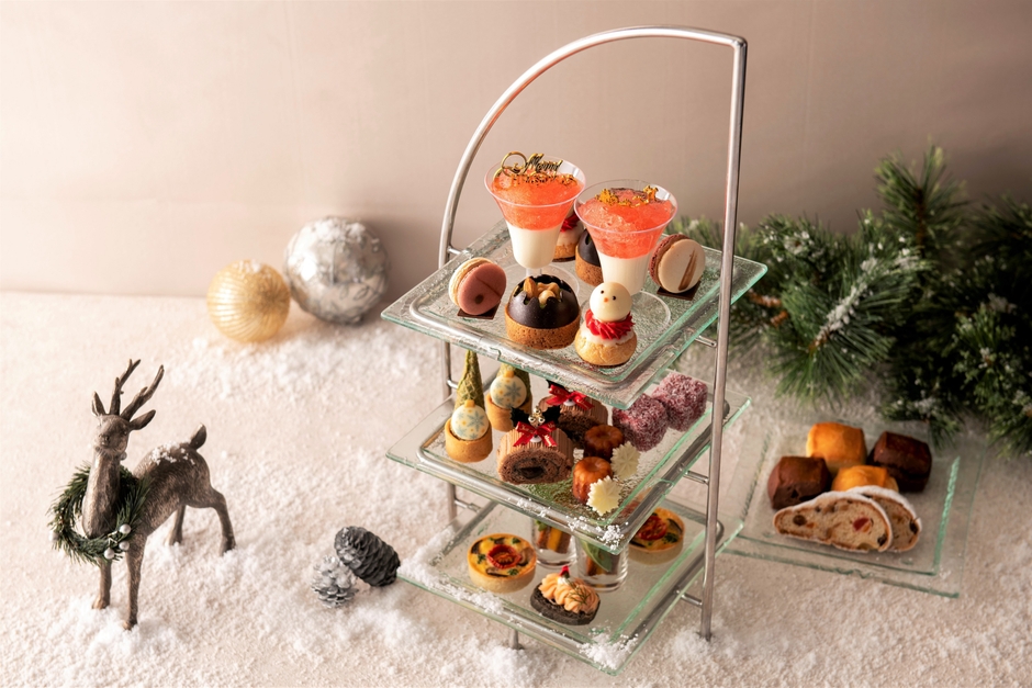 ブッシュ ド ノエルやカヌレなどヨーロッパのクリスマス伝統菓子をはじめ、クリスマスツリーに仕立てたチーズタルトや雪だるまをモチーフにしたシュークリームなど、アドベントシーズンならではの心躍るキュートなアイテムが揃います。また、フォアグラとかぼちゃのミルフィーユや栗ときのこのキッシュなどの趣向を凝らしたセイボリーのほか、グランマニエに丹念に漬け込んだ5種類のフルーツを贅沢に使用した自家製のシュトーレンもお楽しみいただけます。クリスマス期間限定で、グラスシャンパンとともにクリスマス気分を楽しめるプランもご用意いたしました。