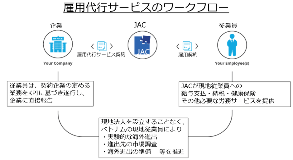 本サービスでは、JAC Recruitment Vietnamが企業に代わり現地人材を雇用することで、企業は現地法人を設立することなく、現地人材を採用することができます。