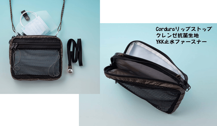 このサコッシュには、清潔を保つための消毒グッズを入れるスペースと、マスクをいれるスペースが用意されています。