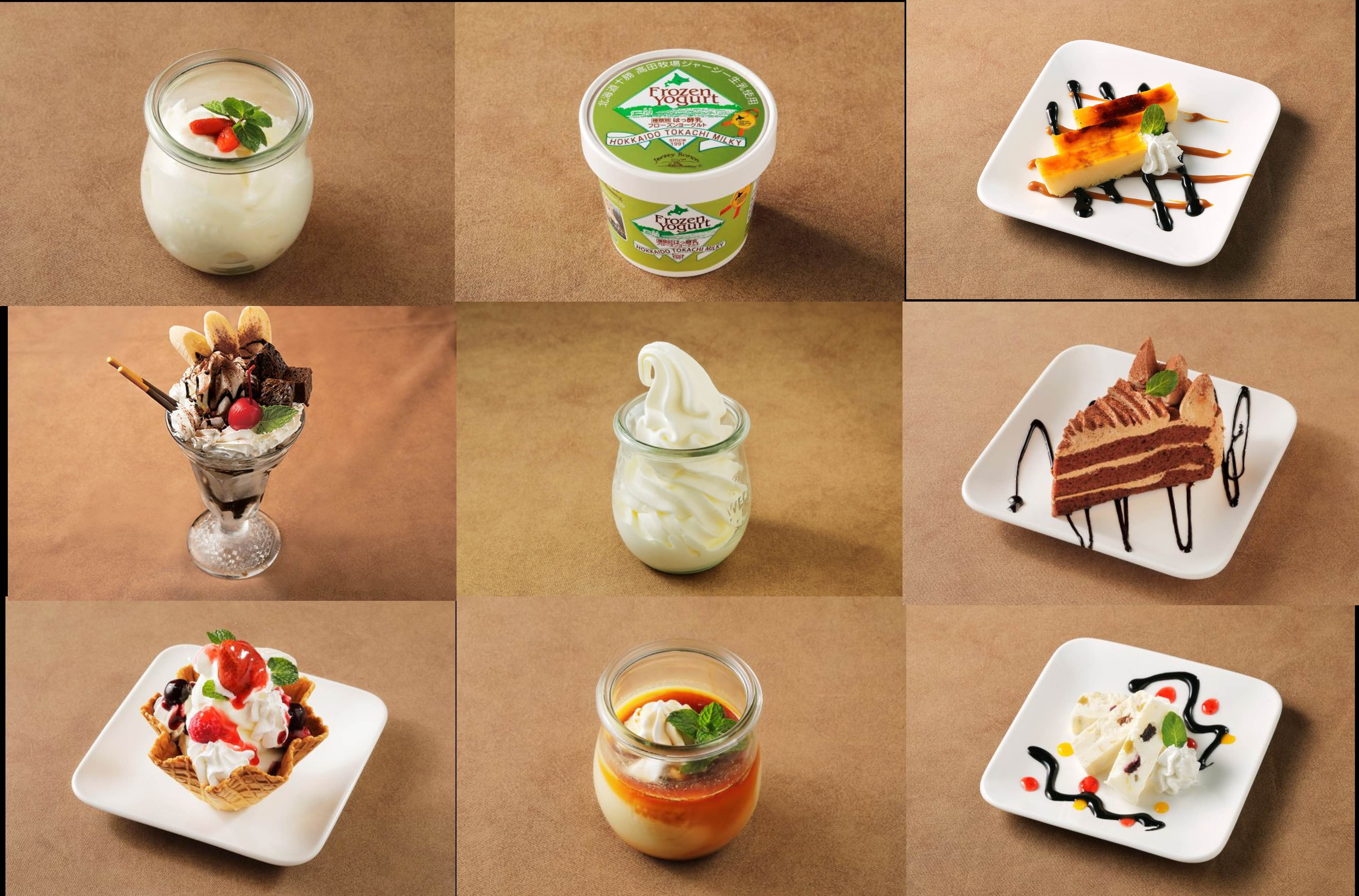 ジャージー牛乳を使用したソフトクリームを使用したパフェやジャージー牛乳を使用した自家製プリンや杏仁豆腐、自社製造のカッサータやカタラーナ、フローズンヨーグルト、アイス。他にカットケーキもご用意しております。本店33種類、木野店40種類と若干の取り扱い商品の差がございます。