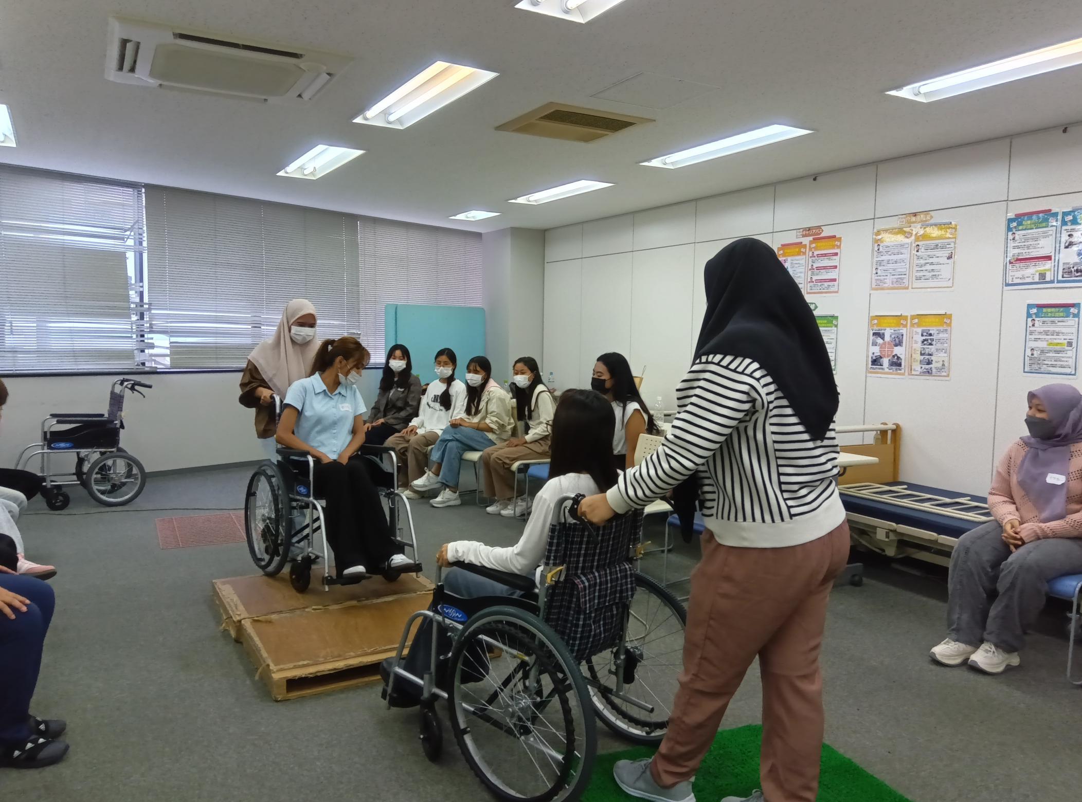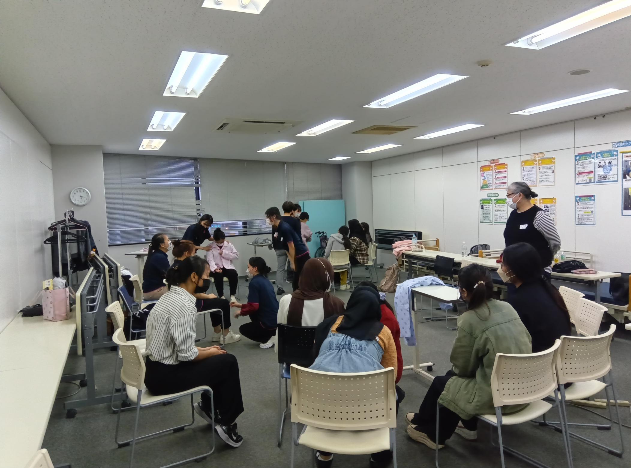 日本語を習得しながら、介護という仕事を理解し、介護に携わるにあたって必要な心構えや基本的知識と技術を身に付けることが目的のコース(実技のみ通学形式)