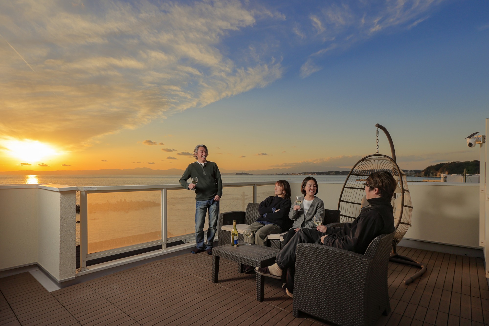 屋上テラスを独り占めできる、眺望自慢の一室。最大の魅力である絶景の屋上テラスからは、森戸神社から江ノ島方面まで広がる美しい海岸線と水平線を一望。夕刻には黄金色に染まる海と、その先に浮かび上がる壮大な富士山のシルエットという、この地ならではの特等席をお楽しみいただけます。設置されたテラスソファに身をゆだね、心地よい海風を感じながら過ごす時間は、まさに贅沢そのものです。